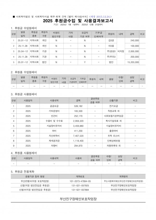 부산진구장애인보호작업장 후원금품 수입, 사용내역을 공고합니다.
